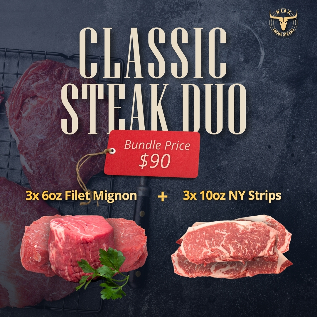 Maximize your savings without sacrificing quality with the Classic Steak Duo Box from Diazprimesteaks. This popular bundle is perfectly curated to give you the ideal balance of tenderness and robust flavor, all for just $90. It’s the smart way to stock up on two of the most popular and highly demanded butcher cuts—ideal for couples, small families, or your next weekend grilling session.